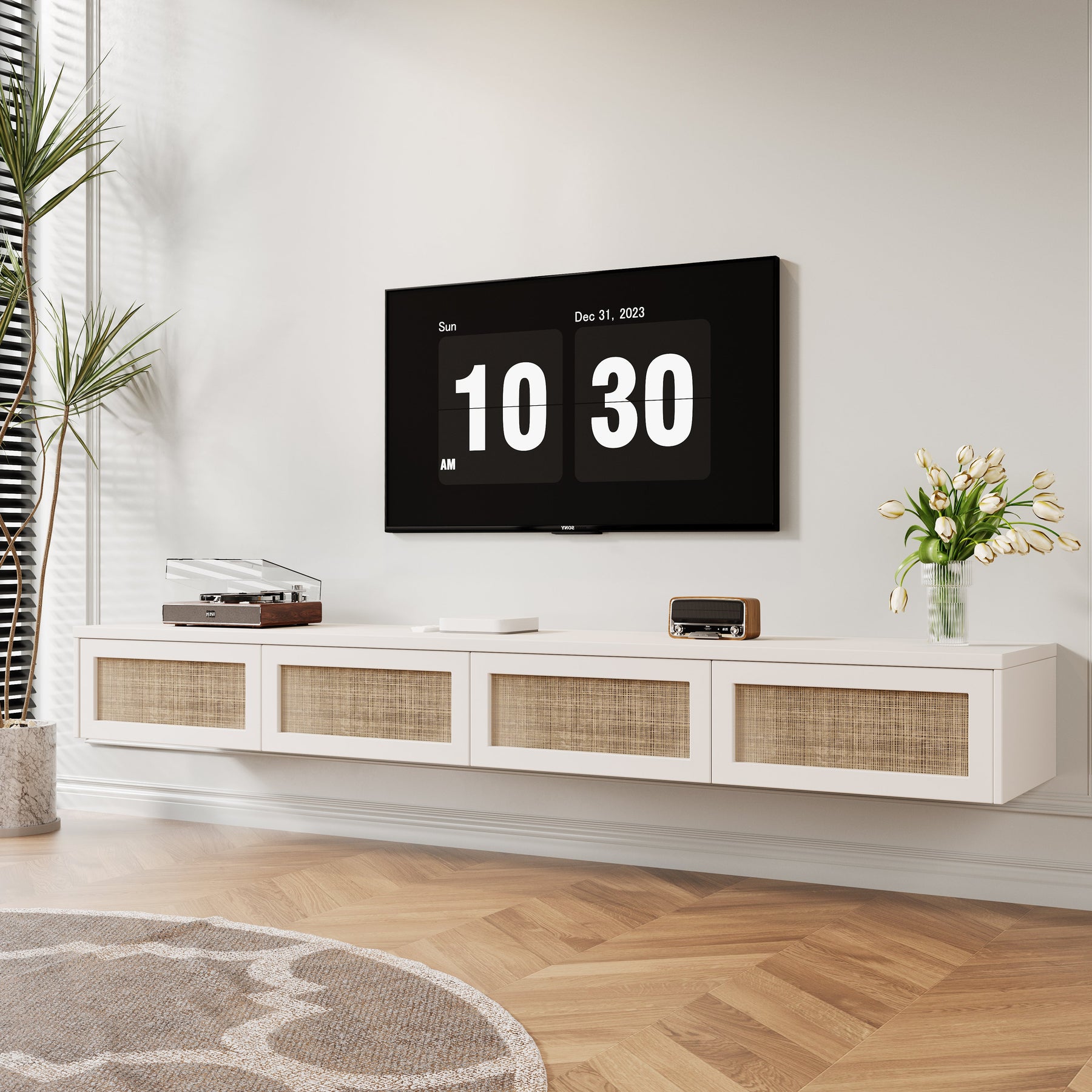 • The design features four front-opening cupboard doors, beautifully detailed in natural rattan cane weave. These woven panels introduce an organic, handcrafted character while remaining lightweight, durable, and visually breathable.